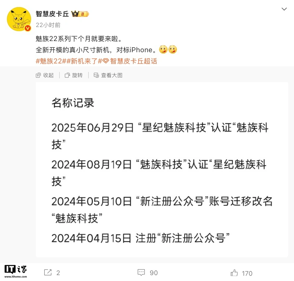 IT之家 7 月 1 日消息,博主 @智慧皮卡丘 发文,透露魅族 22 系列手机将在本月发布,为“全新开模的真小尺寸新机,直接对标 iPhone”。